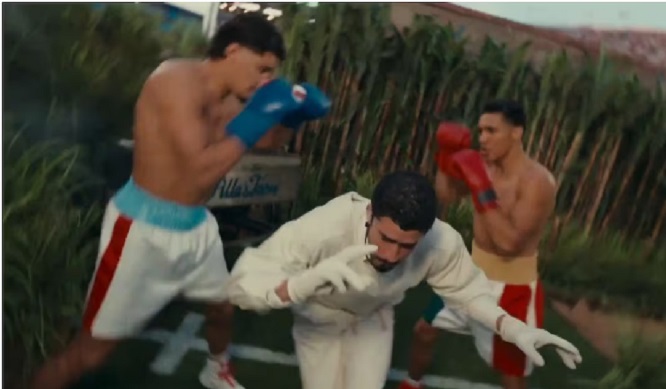 Mientras el cantante recorría un campo de cultivo, con pasajes de su su vida y costumbres de Puerto Rico, pasó entre dos boxeadores que presumían en sus calzoncillos símbolos de su país y de México.