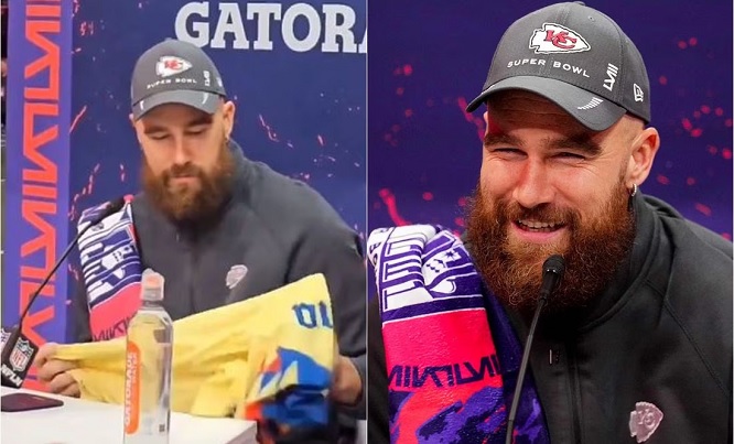 Travis Kelce mostró su alegría por el título del América, en plena conferencia previo al Super Bowl