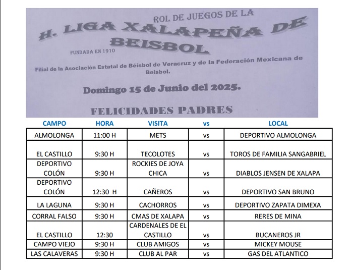 Rol de juegos de la H. Liga Xalapeña de Beisbol