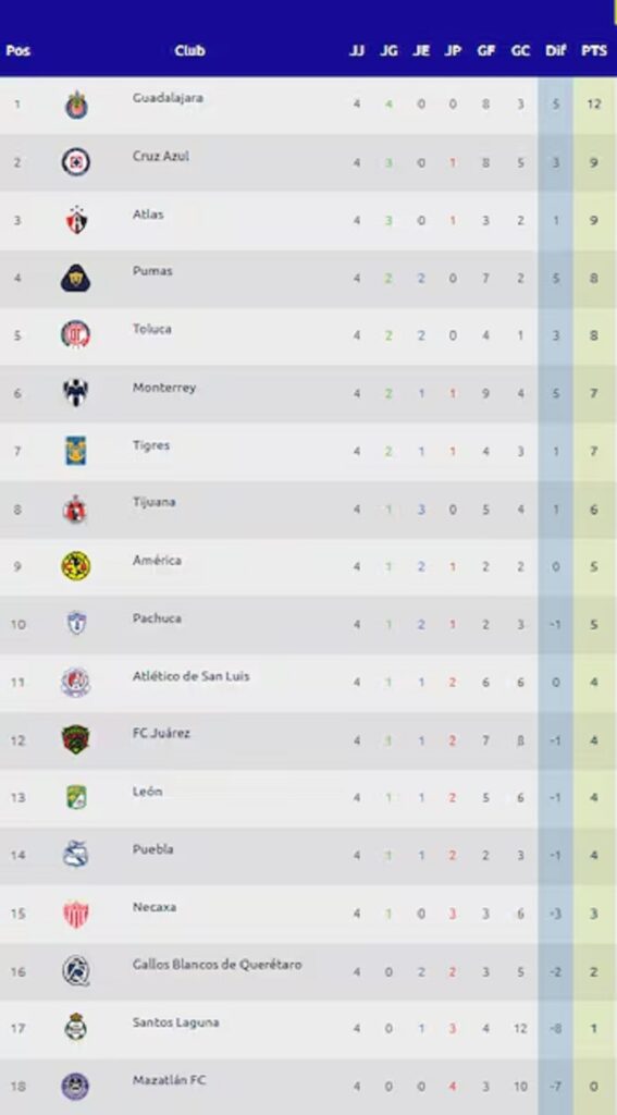 Detrás del Guadalajara aparece Cruz Azul con nueve unidades, las mismas que el Atlas, pero la diferencia de goles coloca a La Máquina en el segundo puesto y los Zorros en tercero.