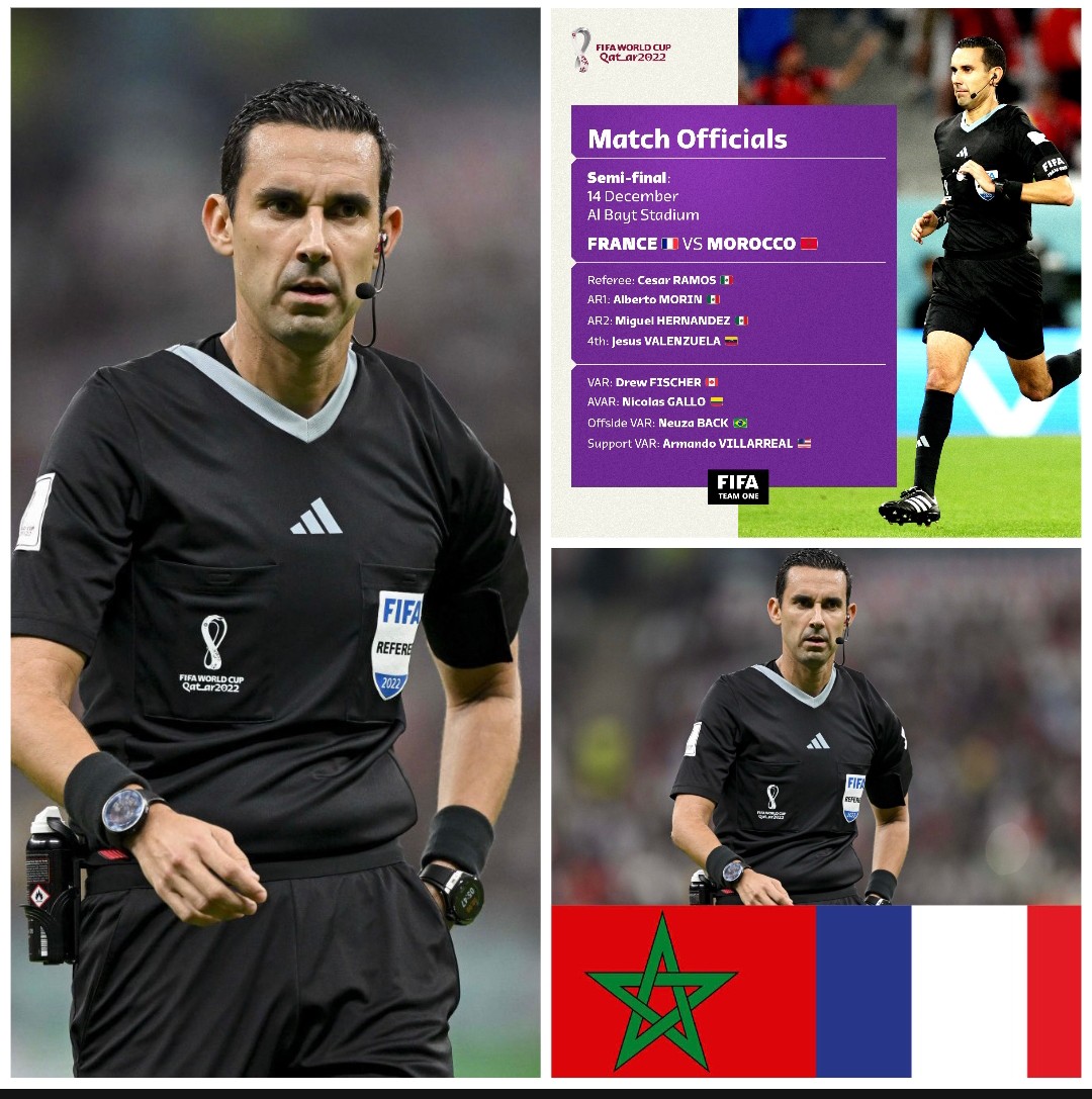 El árbitro Mexicano César Arturo Ramos Palazuelos será el encargado de impartir justicia en el partido de Francia vs Marruecos. El Sinaloense estará acompañado por sus compatriotas Alberto Morín y Miguel Hernández.